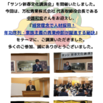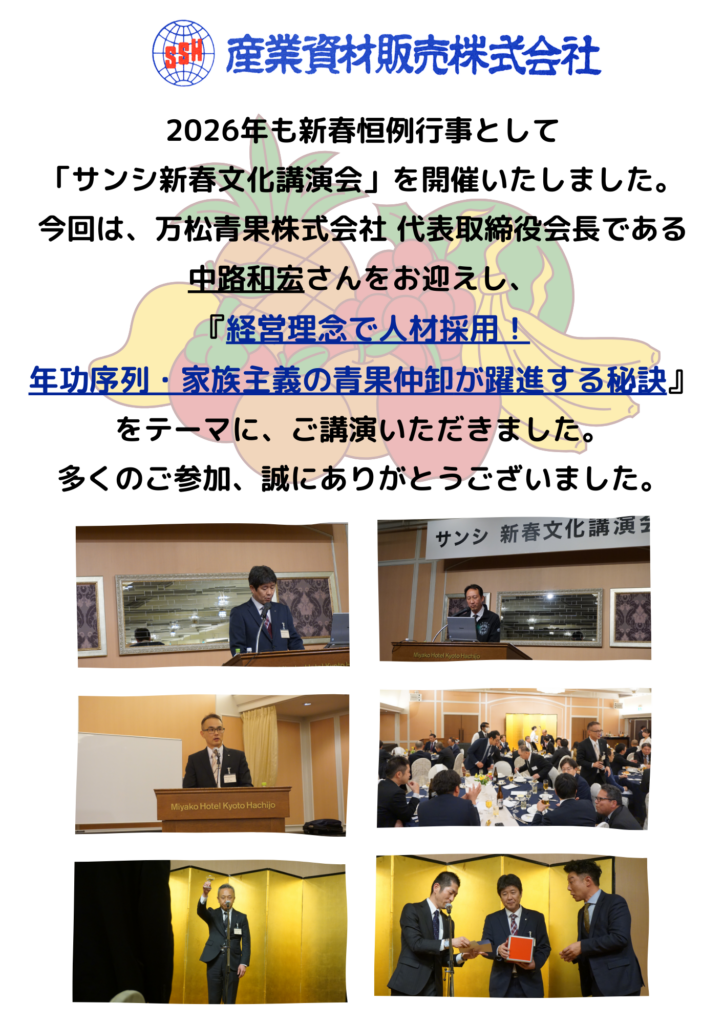 - 2026年 新春文化講演会2026年1月14日に新春文化講演会を開催いたしました。スペシャルゲストに万松青果株式会社 代表取締役会長であ… 続きを読む: 2026年 新春文化講演会