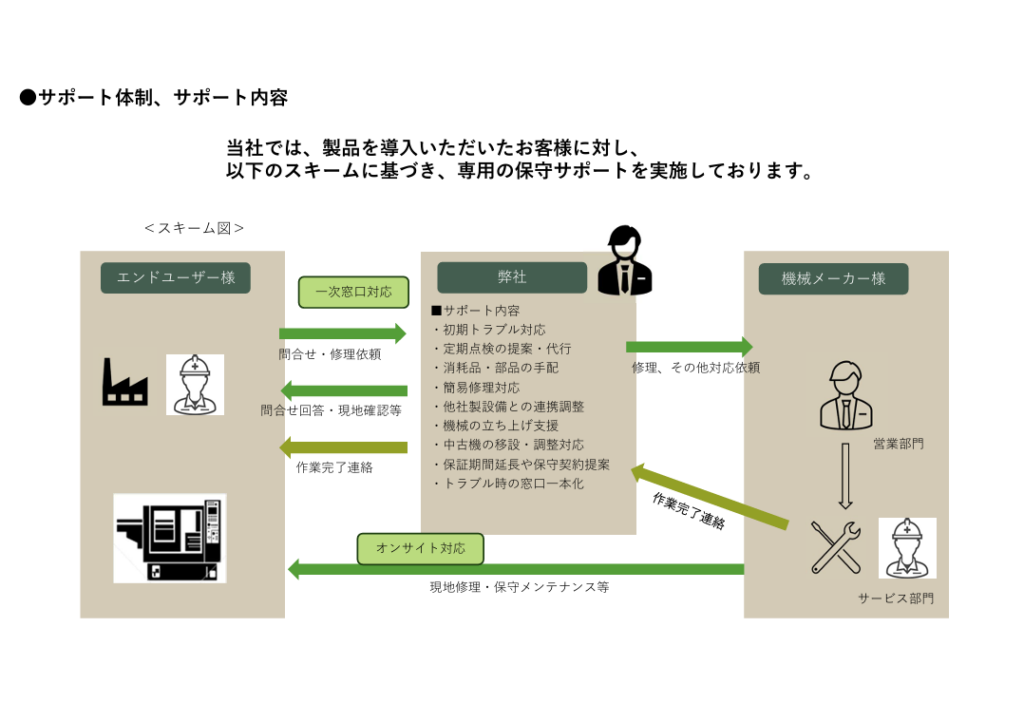 また、製品を導入後においても継続的なフォロー体制を整備しており、保守・運用支援、トラブル対応などを通じて、お客様の安定的な事業運営を支援しております。