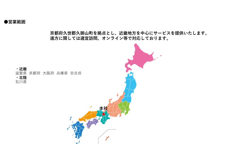 当社では、京都府久世郡久御山町を拠点とし、主に近畿地方を中心に全国のお客様を対象とした営業活動を展開しております。